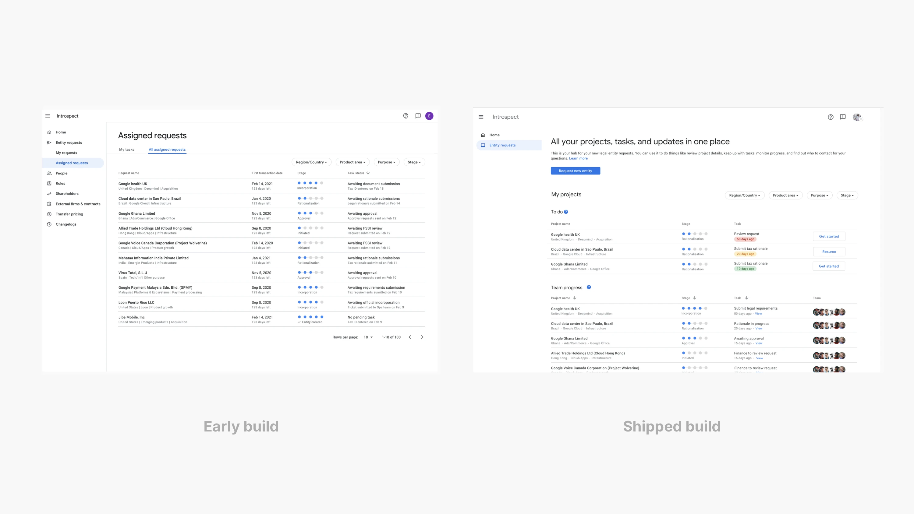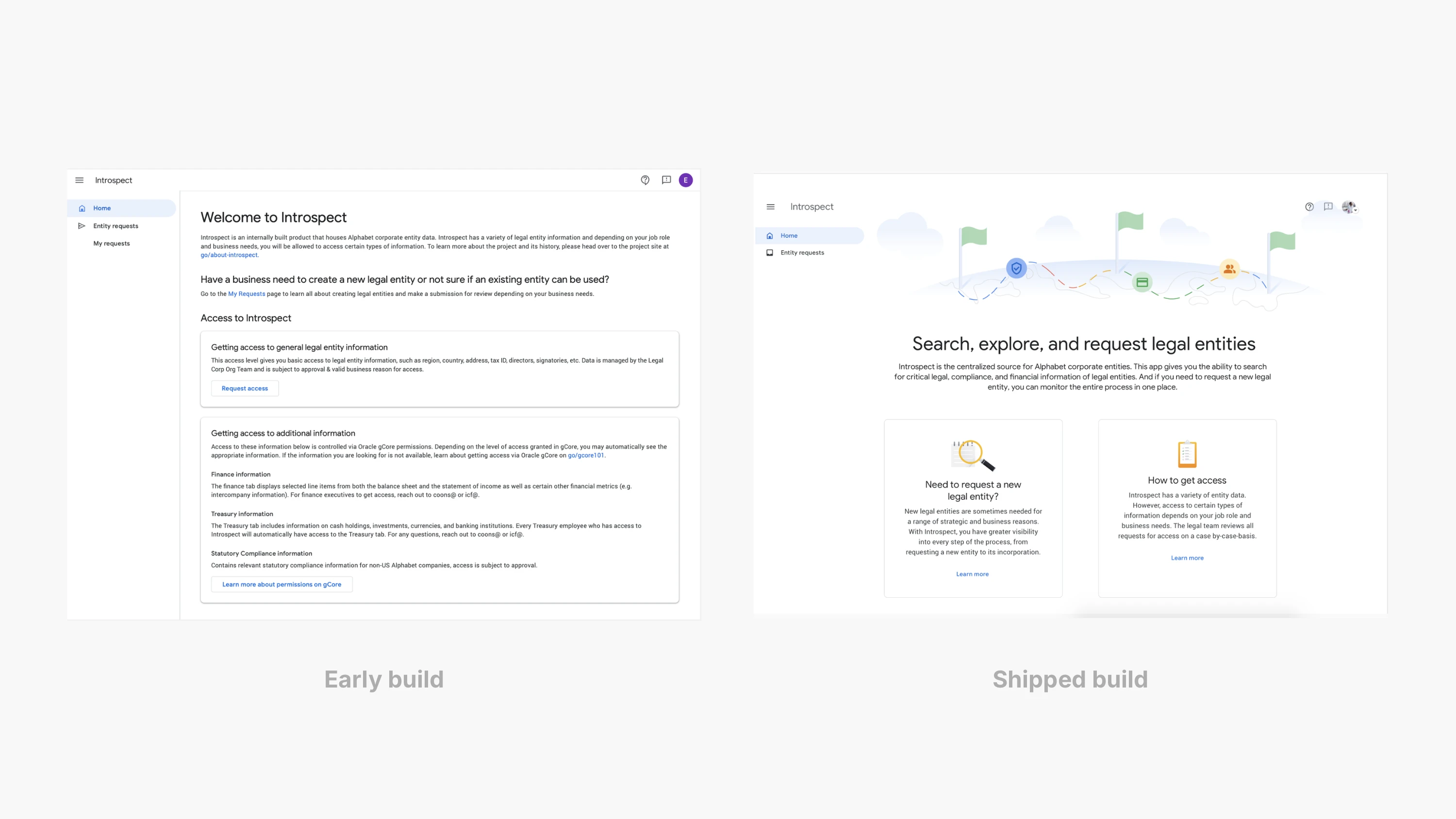 I was the UX engineer on a cross-functional pod inside Google Finance building an internal workflow for legal entity creation (known internally as Introspect). I partnered with product design, a UX writer, and SWEs/data partners; my focus was turning a messy, multi-system process into shippable UI: resilient components, production interactions, and the instrumentation needed to prove it worked.