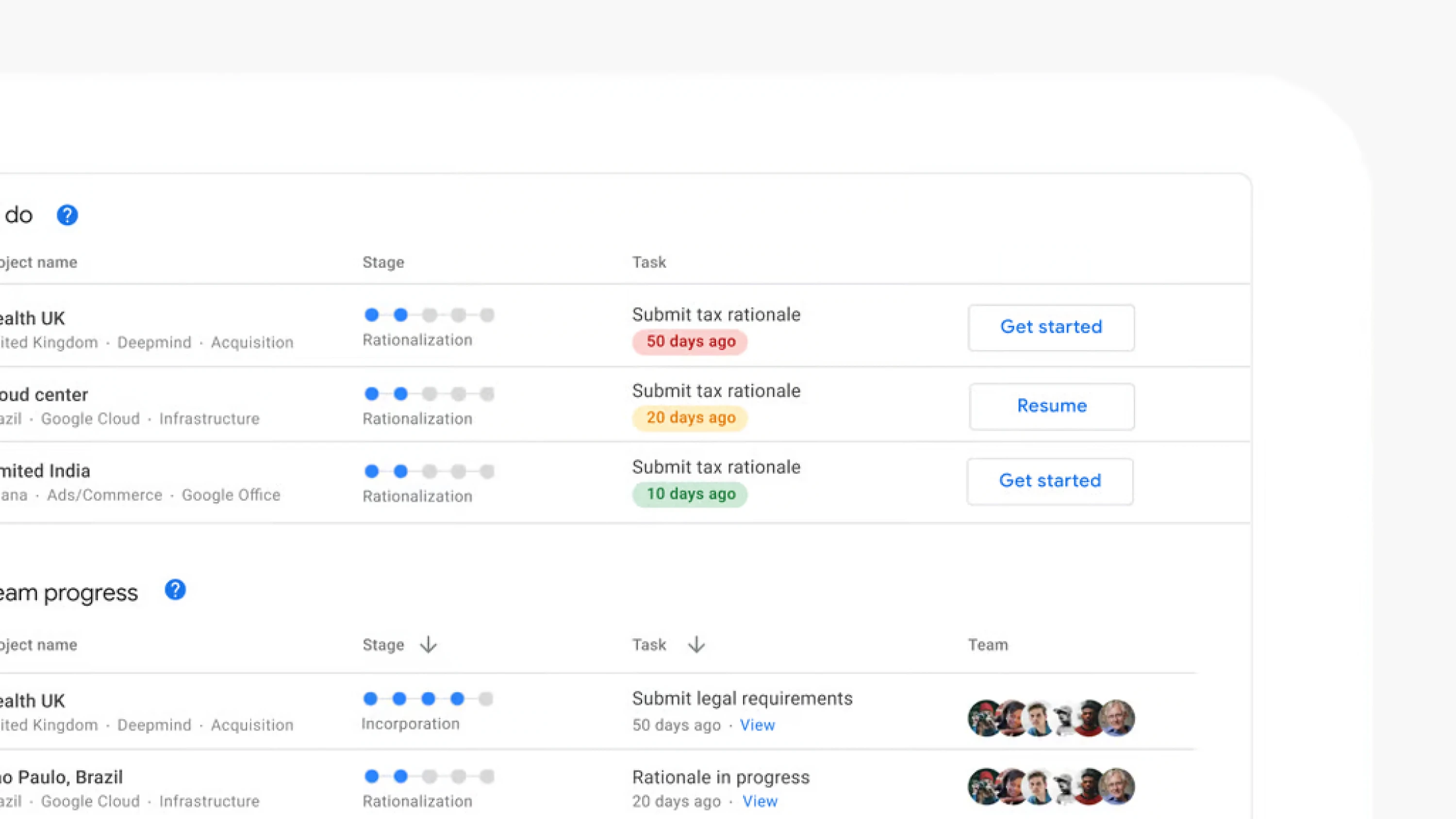 That meant the product had to behave like a workflow, not a warehouse. We gave people a home that answers the first question at a glance: what am I responsible for right now. “My projects” and “Team progress” made the work legible without forcing anyone to reconstruct it from email. Each row reads as a compact status sentence: stage, next task, age, and who is involved. If something is stalled, it looks stalled. If it is waiting on someone, it says so.